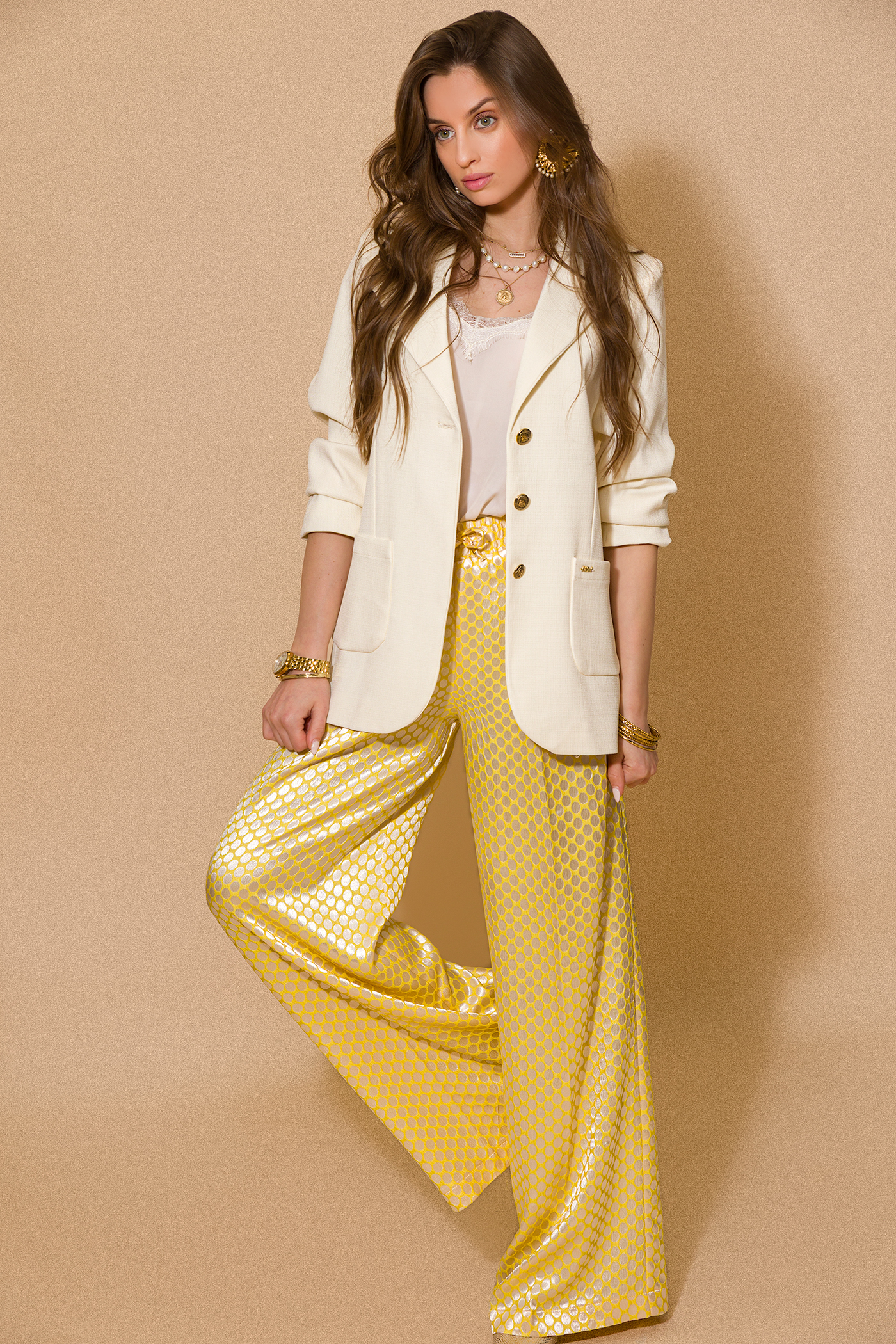 Кройка:структурирана линия, класически ревери и подчертана раменна зона. Силуетът е елегантен, женствен и издължава фигурата.