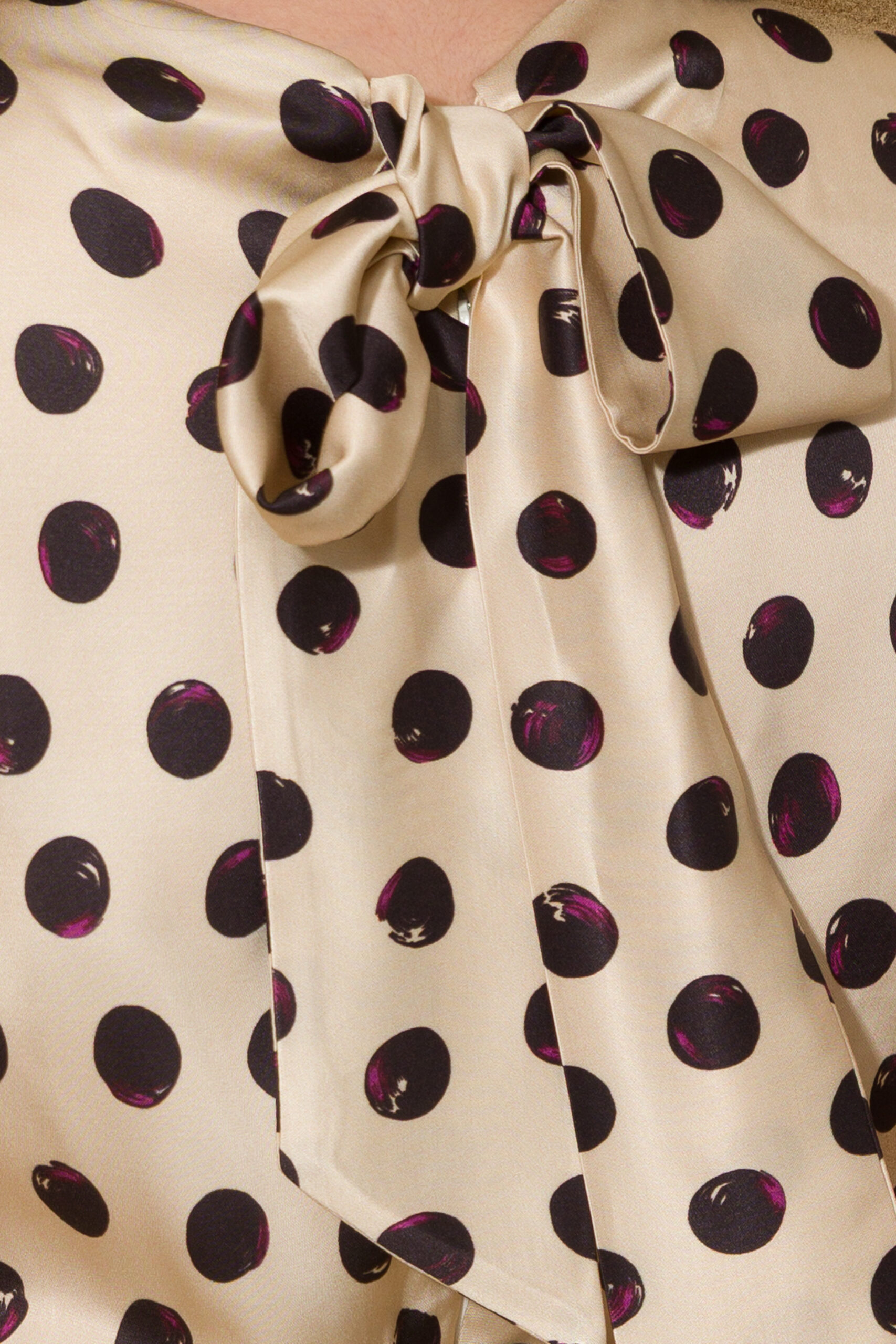 Бутиков дамски гащеризон от луксозна,сатинирана, тежко падаща коприна с елегантен десен на артистични точки. Основата е в мек кремав нюанс, а точките са в дълбок тъмновиолетов цвят с фин сатенен отблясък, който придава луксозно и различно излъчване.