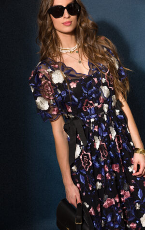 Горната част е вталена, с елегантен ревер в стил сако, който прилепва изящно към бюста и подчертава женствената линия. Ръкавът е кимоно, завършен с маншет, щрифелка и копче. Долната част е богата, в пълен клош, с ефектна миди дължина, която придава движение, лекота и впечатляваща елегантност.